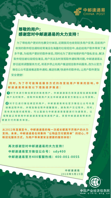 为了尽可能降低服务方式的改变给用户带来的影响,在服务方式正式变更前,中邮速递易已通过快递员APP、微博、微信公众号以及柜屏通知、短信等多个渠道发布通告,确保用户知晓。同时,中邮速递易此次调整服务方式将逐步从短信取件到微信取件的过渡。其中,对于未能及时进行微信绑定的新老用户,中邮速递易仍将发送短信通知提醒用户及时取件,但取件码需用户关注中邮速递易官方微信公众号获取。
