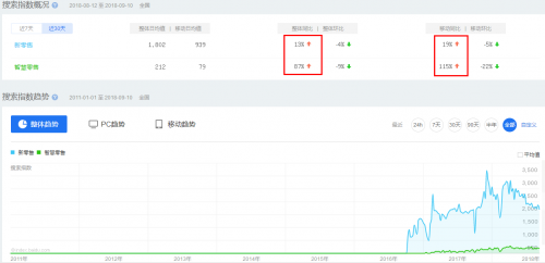 这一论断并非凭空臆测。首先,从能够初步衡量行业影响力和关注的百度指数看,“新零售”和“智慧零售”目前已纳入百度指数。作为最具广泛影响力的零售概念,“新零售”指数远远高于“智慧零售”。但在增幅上,“智慧零售”则保持着近100%的指数增幅。而“无界零售”其影响力较弱,并未被收录至百度指数。从搜索结果上看,新零售高于智慧零售,而无界零售同样最低。