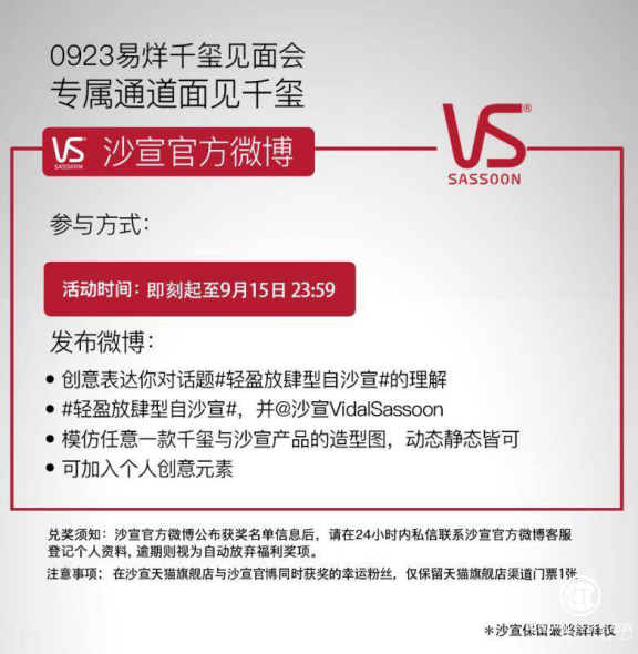 在天猫及沙宣品牌高层和易烊千玺的共同见证下,沙宣首次介绍了其四款新品小脸洗护产品,不同功效针对不同消费人群的新品让消费者在家即可体验沙龙级别的洗护发服务,成就“轻盈不扁塌,蓬松不炸毛”的时尚型格。见面会的最后,沙宣高层宣布了9月26日是专属于沙宣的天猫超级品牌日,届时,会员们将会享受VIP级别的至尊优惠,与天猫及沙宣一起狂欢。