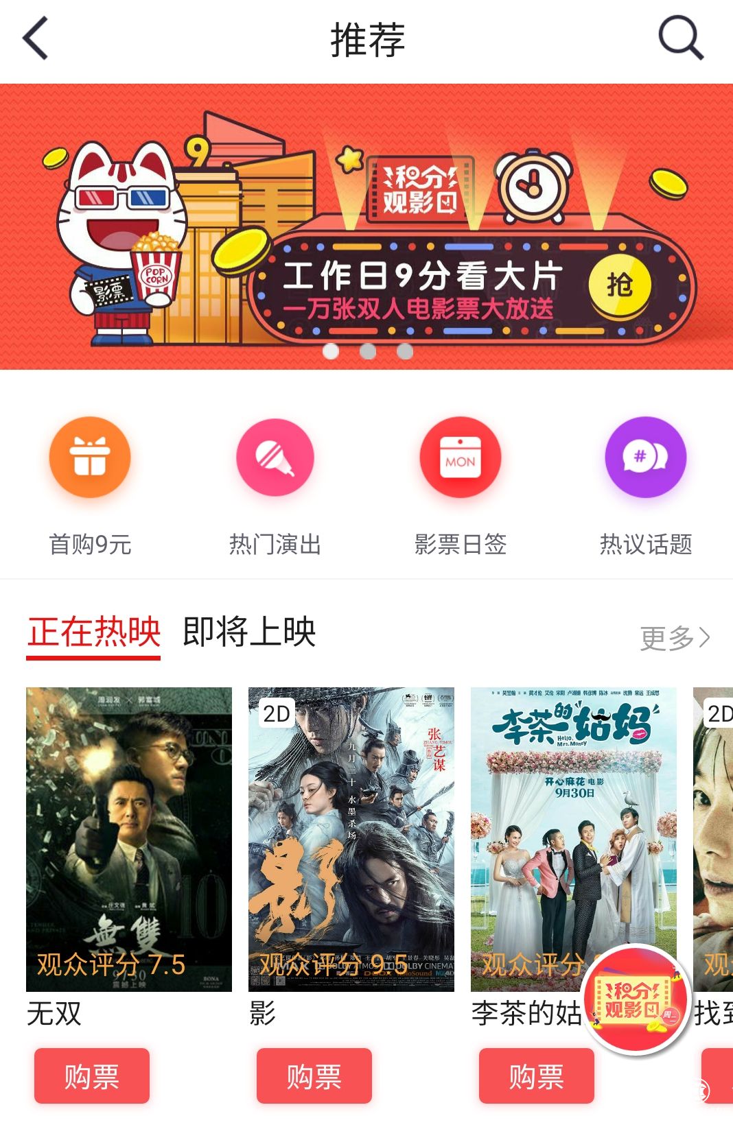 此外,影票平台还不定期开展各类营销活动、优惠观影活动等,如“两人同行一人免单”、“超级观影日”、“工作日9分看大片”等。