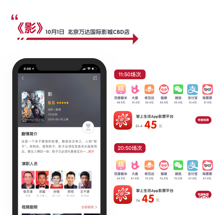 以国庆档较火的电影《影》为例,对比各大购票平台同一影院同一场次的电影票发现,掌上生活App影票平台的购票价格均处于较低水平。