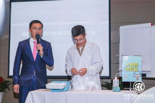 在现场实验中,有一个小插曲,成为了大家的一个梗,插曲是这样的,在两个含有甲醛的烧杯中,一个加入古玛植物凝胶,一个什么都不加,最后,未加古玛植物凝胶的烧杯变成淡蓝色,这时候,朱总就问是不是因为气温和气流的原因,所以颜色不深,我们的实验师就说:“不是的,这是因为我将甲醛浓度调淡了,所以颜色没有那么深”。呐,就这么拆了朱总的台,全场掌声雷动,直呼真实在。