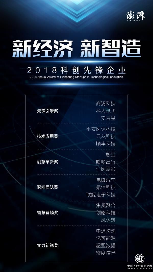 值得关注的是,本次论坛甄选了一系列具有科技感、创新精神,可市场化、商业化、规模化落地,且能产生积极社会影响力的创新企业项目,授予其“2018科创先锋企业”荣誉称号。其中,商汤科技、科大讯飞和安吉星等获得2018科创先锋企业·先锋引擎奖,中通快递、蜜度信息、亿可能源、超盟数据等获得实力新锐奖。完整获奖名单如下: