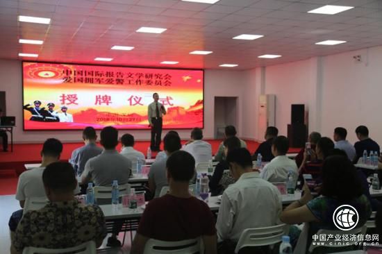 2018年10月27日上午,中国国际报告文学研究会(爱国拥军爱警工作委员会)联络处(深圳市)授牌仪式在广东省军歌嘹亮基地(东莞)隆重举行,出席此次授牌仪式的领导嘉宾有:中国国际报告文学研究会宣传部部长、爱国拥军爱警工作委员会执行主任马新存,中国国际报告文学研究会宣传部副部长兼爱国拥军爱警工作委员会副主任王庆海,国报会爱国拥军爱警工作委员会执行秘书长廖海涛、副秘书长苏敏、林虎,会员部副部长秦景领、罗庆喜、袁正其,广东军歌嘹亮基地(东莞)副总裁万良文,香港梅花篆字艺术研究院院长王斌,江苏宜兴太湖一号董事长李革以及深圳市相关部门负责人共计60余人参加了会议。