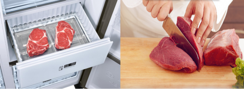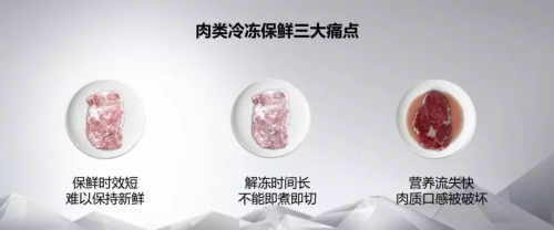 现实生活当中,都市商务人群早出晚归已成常态。如何能够在肉类保鲜的前提下,实现即切即煮,省去漫长的解冻时间,消费者非常关注的痛点。而对于肉类食材如何实现长小长效保鲜,并且减少营养流失,同样是冰箱行业急需攻破的难题之一。