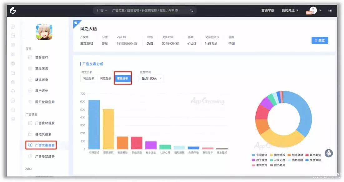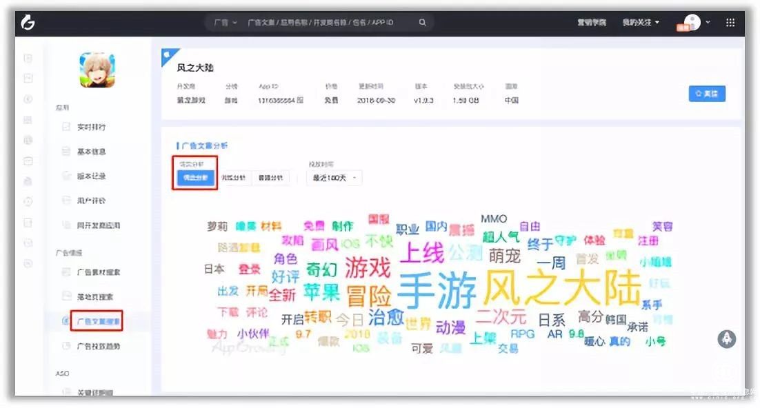 App Growing将所覆盖追踪的40+流量平台的广告文案进行汇总分析,让优化师们能够在该页面看到正在投放或者曾经投放过的文案,同时提供行业筛选和关键词搜索功能,让用户更方便快捷地找到自己想要参考的文案创意。此外,App Grwoing还对广告文案进行汇总分类,囊括词云分析、词性分析、套路分析。
