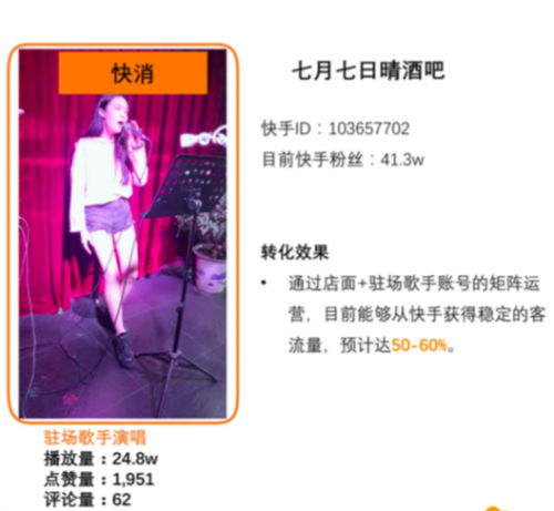商家在进行短视频营销时应充分考虑场景这一核心要素, 以达到更好的传播效果。在快手平台获得的关注度能够高效地在相应实体店面变现。同时快手平台人工智能技术实现精准匹配推送至需要的人群,形成了资源的高效匹配。例如酒吧驻唱歌手通过在快手平台发布演唱视频的方式积累的人气能够转化为真实客流。