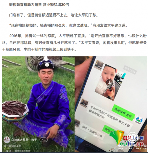 锡林郭勒盟乌拉盖草原的蒙古族汉子太平,通过在快手记录自家制作牛肉干的过程,吸引了众多快手老铁的关注,逐步打开了市场,扩大了生产规模,并带动当地贫困户脱贫致富。