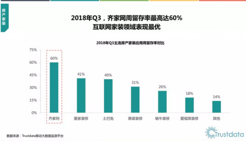 报告显示,在2018年Q3主流房产家装应用周留存率对比中,齐家网周留存率最高达60%,远高于土巴兔、爱家装修、惠装装修、蜗牛装修等,稳居行业第一。