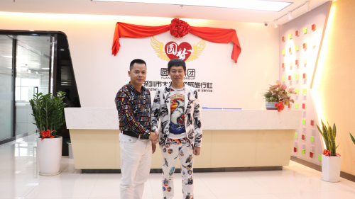 图注:圆梦集团董事长曾亚勇先生与国际功夫巨星(著名导演)陈天星在新成立的圆梦集团国际旅行社千握手留影