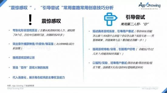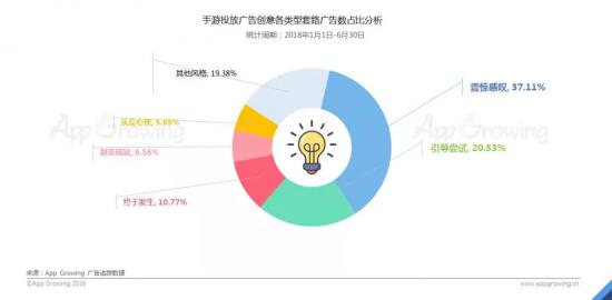 基于AI智能及机器学习的技术,App Growing对2018年上半年的手游广告创意文案创意进行自动化分类。手游广告创意主要围绕震惊感叹、引导尝试 、终于发生 、制造稀缺 、从众心理这五大套路,相关广告数累计占比超过80%。而广告创意文案中采用震惊感叹文案套路的广告占比最多,占37.11%,而爱奇艺广告平台则高达47.8%。