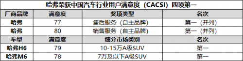 值得一提的是,在市场口碑层面,哈弗H6刚刚赢得用户Pick的全行业“No.1”。中国质量协会最新公布的2018年中国汽车行业用户满意度(CACSI)测评结果,哈弗H6获10-15万A级SUV用户满意度第一,累计4年获此殊荣。