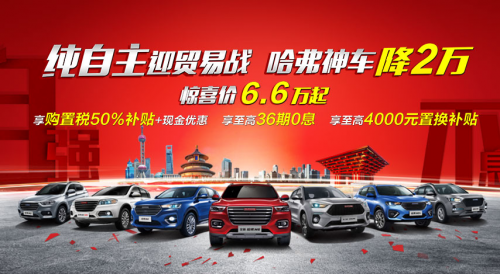 此外,哈弗热销车型新哈弗H6 Coupe、2018款H6运动版等车型,均在购置税减半优惠补贴基础上,叠加享受“纯自主迎贸易战,哈弗神车降2万”活动现金优惠,综合优惠额度高达1.5万-2万元;2018款哈弗H2、H2s则享受1.4万-1.7万元不等的现金优惠,哈弗M6更是直接官降达2.4万元,仅售6.6万起。