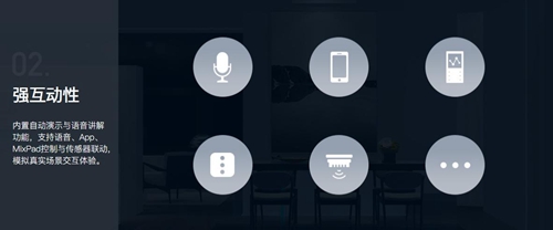 第二大优势为“强互动性”,欧瑞博mini体验厅支持自动演示与语音讲解,并且语音、智家365 App、MixPad控制与传感器联动等常见智能家居操控方式一应俱全。值得一提的是MixPad,mini体验厅功能与功能强大的MixPad完美配合,一方面体现了MixPad全面的兼容性,另一方面也体现了mini体验厅对现实场景的完美模拟。