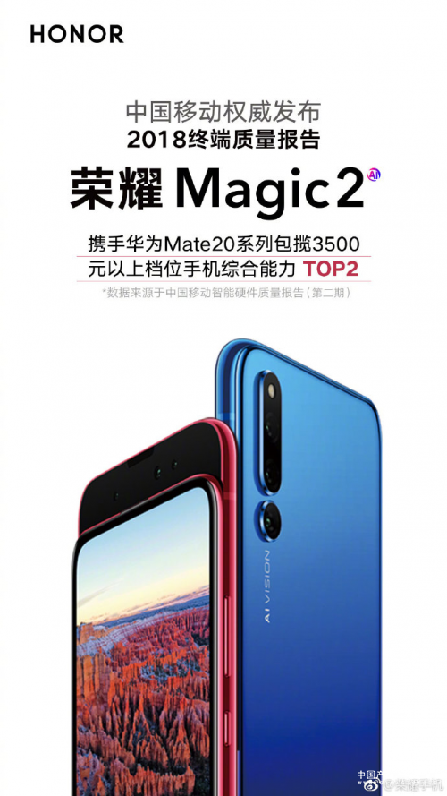 除此之外,在中国移动最新发布的手机综合榜单中,荣耀Magic2与华为Mate20包揽3500元档以上手机综合能力冠亚军。