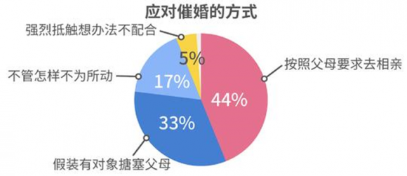 调查显示,对于被催婚,接近六成单身男女表示“抵触”或“难理解”、“搪塞过去”。超过4成单身男女表示是“硬着头皮去相亲”。