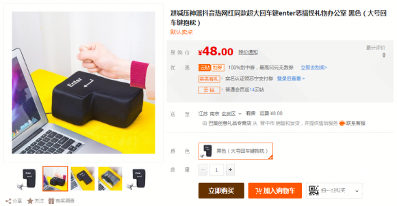 苏宁易购客服人员小冯买了一个“大号Enter键”。“在抖音上看到这个,听说是解压神器,就买了一个。”小冯告诉我们,“不过这个其实作用不大,对我来说,最好的解压方式就是耐心解决用户的问题,用户满意了,我的压力也就小了。”