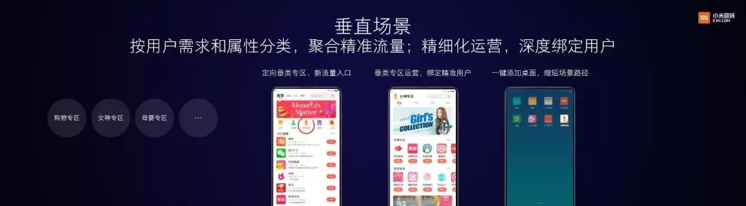 仇睿恒提出3个关键词:精准化、内容化、全场景。例如“女神专区”“二楼”这样精准化的专区与内容栏目,以及浏览器、全局搜索、小米音乐、小米主题、多看阅读等各场景下的创意分发媒介,旨在通过内容与场景的深度结合,提高用户的粘性,同时提升媒介分发的效率。