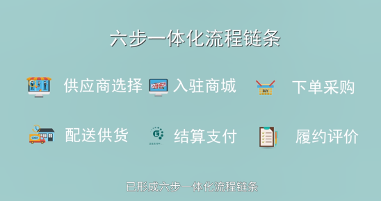 电商化采购业务流程规范运转高效,已形成六部一体化流程链条,供应商选择、入住商城、下单采购、配送供货、结算支付、履约评价。