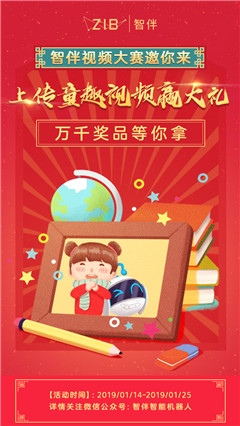 春节的钟声已逐渐敲响,这个春节,如果你想体验一场童趣十足,花样十足年味十足的新春狂欢,那就来参加智伴科技主办的“智伴视频大赛”,展现孩子的可爱,赢取丰厚现金大奖!更多活动详情请关注“智伴智能机器人”微信公众号及“智伴儿童机器人”官方微博,精彩大奖等你来!