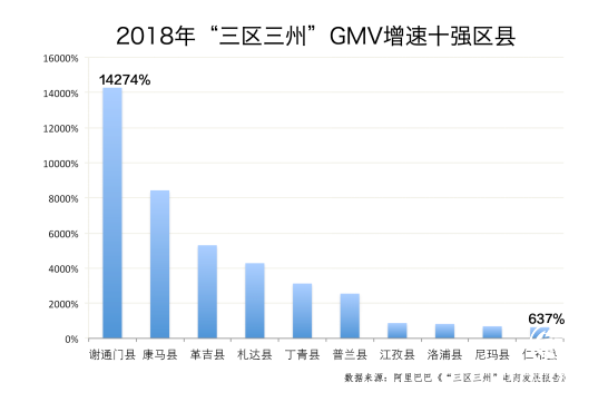 数据显示,2018年,“三区三州”209个区县,共有53个区县网络销售额(GMV)翻番;增速最快的10个区县,西藏占9席,排在第一的日喀则市谢通门县,GMV同比增长142倍。