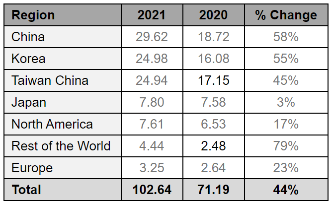 韩国是第二大设备市场,在2020年实现强劲增长后,销售额增长55%,达到250亿美元。中国台湾地区增长45%,达到249亿美元,位居第三。欧洲和北美分别增长了23%和17%,并继续从2020年的收缩中复苏。世界其他地区的销售额在2021上升了79%。从各类设备2021年销售额较2020年增长幅度来看,晶圆加工设备增长44%,其他前端销售增长22%,封装设备整体增长87%,总的测试设备增高涨30%。