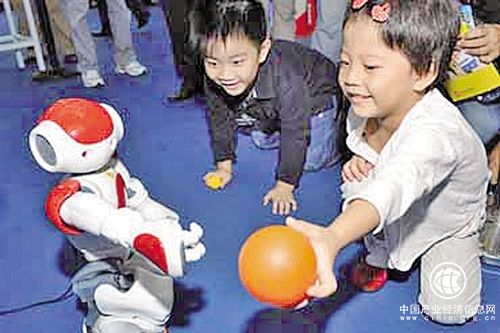 中国科技大学研制的智能机器人与小朋友互动。 (资料图片)