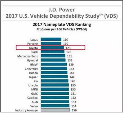 说丰田是日系中最靠谱的品牌,其实一点也没夸大。在美国,丰田已经连续五年荣登《美国消费者报告》汽车可靠性排行榜榜首,这个号称“永不接受任何商家’充值”的第三方评测机构在业内颇为权威;在2017年美国J.D.Power的汽车可靠性调查(VDS)中,丰田排在第三,仅次于并列第一的雷克萨斯和保时捷。可以说,在美国销售的所有品牌中,可靠性能像丰田这样长期名列前茅的,除了保时捷还真找不出第二个了,很多豪华品牌甚至还达不到平均值。