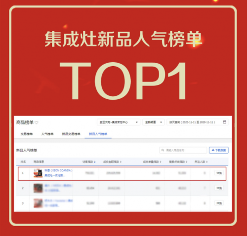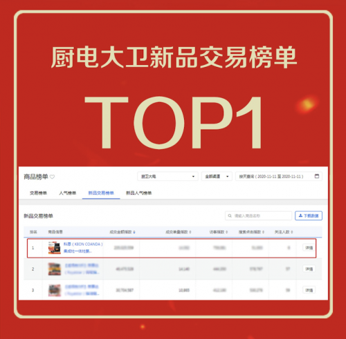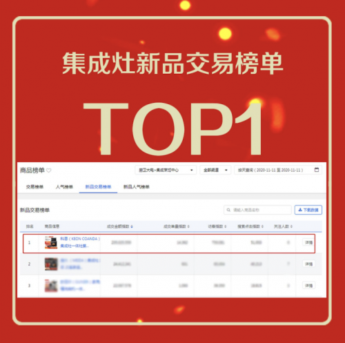 经过几个月的精心备战,科恩电器交上了京东双十一狂欢购物节的满分答卷。在经历了24小时的激战之后,截止至2020年11月11日24时,科恩电器线上线下成交额破新高!双十一巅峰战报,新品双料四冠王!厨电大卫新品交易榜单TOP1,厨电大卫新品人气榜单TOP1,集成灶新品交易榜TOP1,蒸烤消一体集成灶新品人气榜单TOP1!足见科恩蒸烤消一体集成灶的受捧热度!