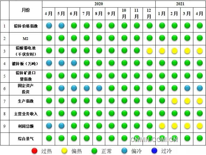 2021年4月,在构成中国铅锌产业月度景气指数的9个指标中,铅酸蓄电池、生产指数和利润总额3个指标位于“偏热”区间运行。铅锌价格指数、M2、镀锌板、铅锌矿进口量和主营业务收入5个指标位于“正常”区间运行;固定资产投资1个指标位于“偏冷”区间运行。中国铅锌产业月度景气信号灯如图2所示。