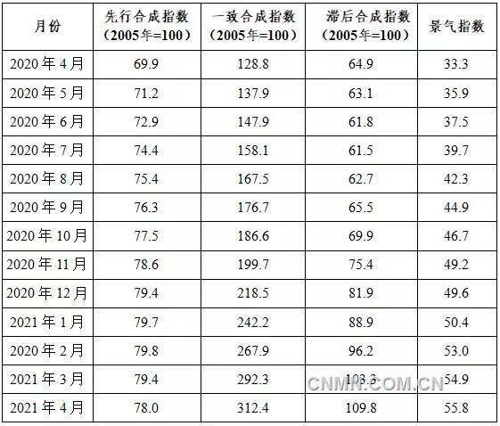 2021年4月,中国铅锌产业月度景气指数为55.8,较上月上升0.9个点;先行合成指数为78.0,较上月下降1.4个点;一致合成指数为312.4,较上月上升20.1个点(近13个月中国铅锌产业月度景气指数如表1所示)。