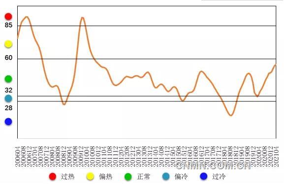 2021年4月,中国铅锌产业月度景气指数持续回升,较上月上升0.9个点至55.8,位于“正常”区间上部运行。中国铅锌产业月度景气指数运行趋势如图1所示。