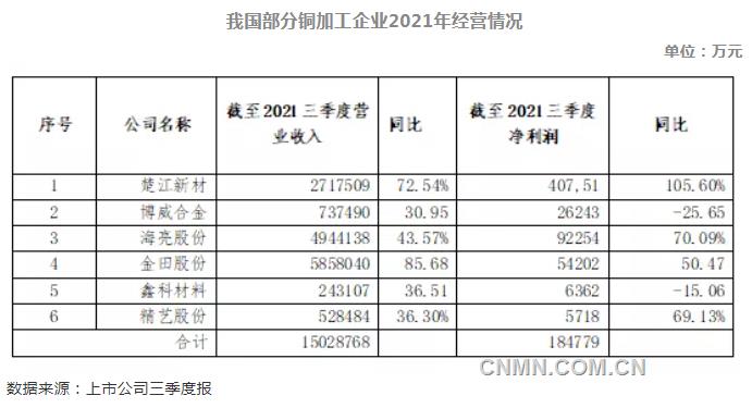经济效益方面,得益于价格上涨,行业企业销售收入和利润均有较大幅度提升。其中2021年1-10月,国内铜矿山、冶炼、加工主营业务收入分别同比增长35%、40%、41%。利润总额分别同比增长150%、85%、52%。从今年上市公司三季度报看,江西铜业、铜陵有色、云南铜业、紫金矿业、白银有色等5家上市公司共实现销售收入7500亿元,较上年同期增长38%。共实现利润187.8亿元,同比增长154%。6家铜加工上市公司共实现销售收入1500亿元,实现利润18亿元。利润和销售收入均实现大幅增长。