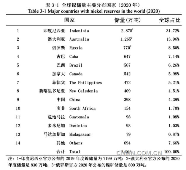 中国地质调查局发布的《全球锂、钴、镍、锡、钾盐矿产资源储量评估报告(2021)》显示,截至2020年,全球镍矿储量为9063万吨,资源量为2.6亿吨,印度尼西亚位居全球储量第一,澳大利亚、俄罗斯等国资源丰富。