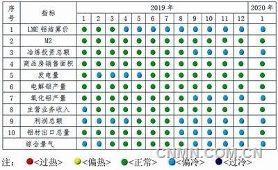 由中色铝冶炼产业景气信号灯(见表2)可见,2020年1月,在构成铝冶炼产业景气指数的10个指标中,LME铝结算价、铝冶炼投资总额、氧化铝产量、利润总额等4个指标继续位于“偏冷”区间;M2、商品房销售面积、发电量、电解铝产量、主营业务收入和铝材出口总量等6个指标处于“正常”区间。