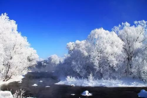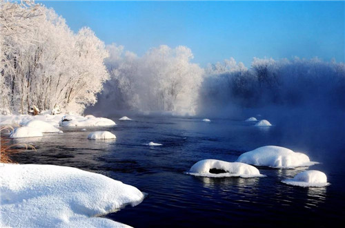 当天,气温接近零下30摄氏度,但潺潺流水依旧冒着“热气”,岸边的树木披上一层银白色的“外衣”,一眼望去,宛若置身“童话世界”。