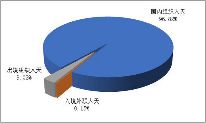 按照国内组织人天、入境外联人天、出境组织人天三项指标,国内旅游、入境旅游、出境旅游市场人天所占份额依次为96.82%、0.15%、3.03%。(见图7)
