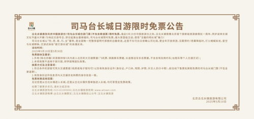 2025年5月10日-5月30日期间,司马台长城日游面向外地游客免票,持5日内进京大交通票据即可兑换长城日游免费门票(不含索道)。双重福利叠加,为家庭出游提供高性价比选择,激活文旅消费新动能。