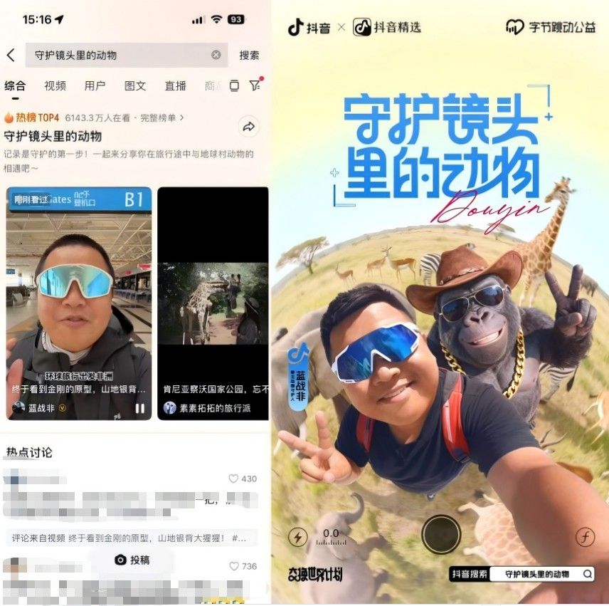 在抖音“创作阶梯计划”支持下,蓝战非的公益行动还带动了40多位跨领域创作者共创,通过多元视角记录世界各地的动物故事,让“守护野生动物”从个体发声升级为跨地域、跨圈层的集体行动。他的视频摒弃说教式表达,以真实体验和朴素情感引发观众共情,在斯里兰卡搜寻蓝鲸未果时呼吁“保护海洋”,在非洲草原相遇野生动物时传递“谦卑路过另一个生命世界”的理念,让正能量内容获得更广泛的传播穿透力。