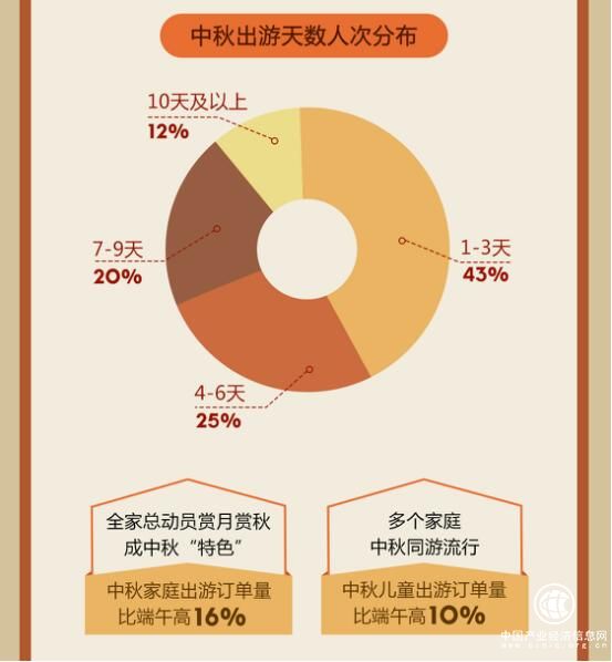 整体而言,中秋节期间,选择出游天数1-3天的游客人次占比达到43%;4-6天的占比25%;7-9天的占比20%;10天及以上的占比12%。从前后假期来看,由于国庆假期时间更长且10月8日-12日请5天假可凑成13天长假,使得不少游客将长线出游计划安排在国庆假期,也因此短线周边游在中秋假期更受欢迎。