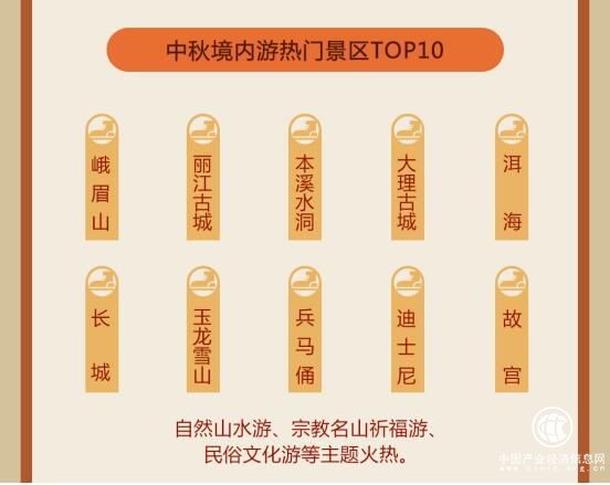 整体而言,中秋假期期间境内游热门景区TOP10包括峨眉山、丽江古城、本溪水洞、大理古城、洱海、玉龙雪山、上海迪士尼乐园、八达岭长城、秦始皇帝陵兵马俑博物院、故宫,自然山水游、宗教名山祈福游、民俗文化游等主题火热。此外,追寻层林尽染的秋色,也是游客的中秋出游热门之选,内蒙古额济纳旗胡杨林的璀璨、新疆喀纳斯白桦林与西伯利亚落叶松的金黄、云南腾冲银杏村的缤纷、四川稻城亚丁的彩色之美,都令游客流连忘返。