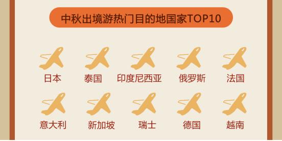 此外,中秋假期虽短,也未能挡住出境游爱好者的出游热情。《报告》显示,日本、泰国、印度尼西亚、俄罗斯、法国、意大利、新加坡、瑞士、德国、越南位居中秋十大出境游热门目的地。其中,四季皆宜、秋季可赏秋的日本高居榜单首位;也有不少游客前往泰国过了一个别开生面的“祈月节”