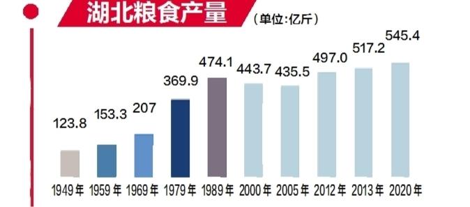 从1949年至2020年,湖北年均粮食总产从123.8亿斤跃升至545.4亿斤,翻了两番以上,71年累计产粮2.6万亿斤,为端牢“中国饭碗”作出了巨大贡献。