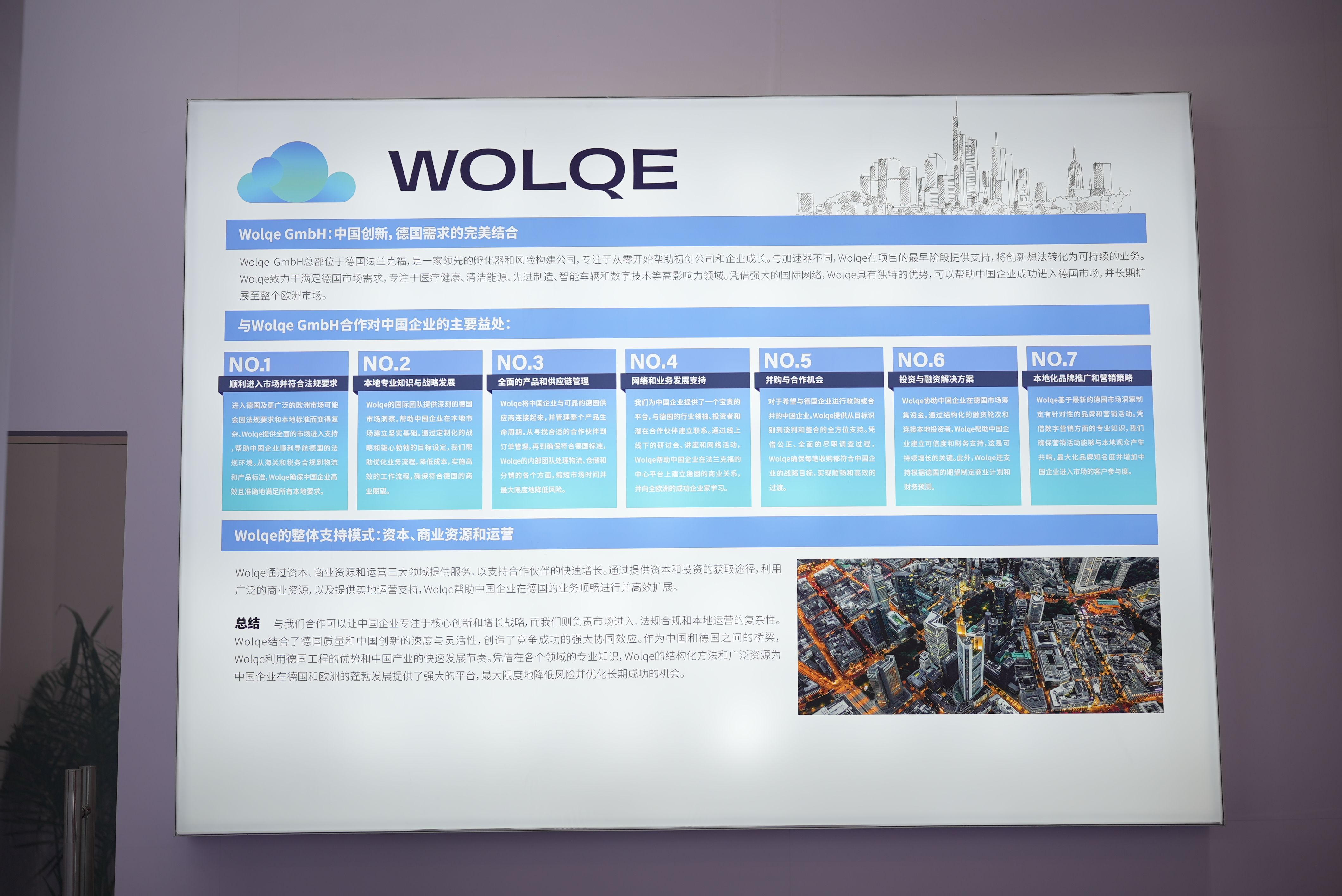 WOLQE公司代表表示,“在未来几年中,我们计划深化对可再生能源、智能汽车、健康生活和先进制造领域的关注,加速数字化转型,并加强跨境合作。利用我们广泛的网络和专业知识,我们致力于帮助更多中国企业在德国建立坚实的立足点,并成功进入欧洲其他市场”。WOLQE的公司战略表明,注重技术链、价值链和生态链的全面联动,同时强调产业链的深度整合,是实现资源最优配置和价值最大化的关键路径。