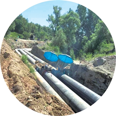 汇能控股集团蒙南电厂铺设供热管道施工现场。