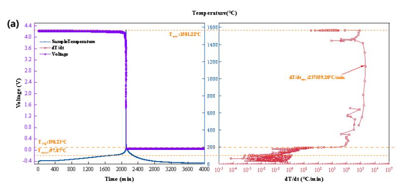 图2 三元九系电池热失控(a)温度&电压-时间曲线、温升速率-温度曲线和(b)附加热电偶温度-时间曲线