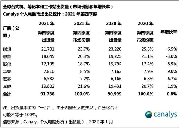 具体来看,去年第四季度,联想在个人电脑市场稳坐第一,总出货量为2170万台,同比下降6.5%,同时,联想也是2021年全年出货量最大的供应商,出货量为8210万台,同比增长13.1%。