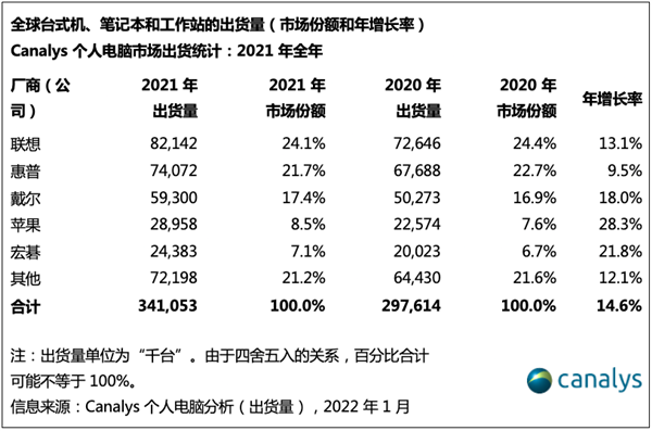 日前,市场调查机构Canalys公布2021年全球个人电脑市场数据。数据显示,2021年全球个人电脑出货量同比增长15%,达到3.41亿台,比2019年增长27%,创2012年以来新高。