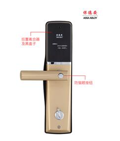 同时增加的防猫眼按钮则加强了防盗功能,一般电子锁只需下压室内把手便能开门,这样造成不法歹徒轻易通过破坏猫眼,把猫眼工具伸入室内开锁盗窃。而在室内把手上加个防猫眼按钮,开门时必须先按下这个按钮再下压把手方能开门,这使消费者能享有更加安全、智能、时尚的生活体验。