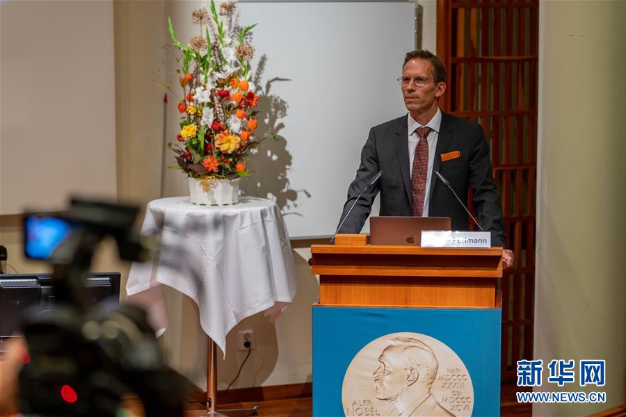 10月5日,在瑞典斯德哥尔摩的卡罗琳医学院,评奖委员会秘书托马斯·佩尔曼在新闻发布会上回答问题。 新华社发(魏学超摄)